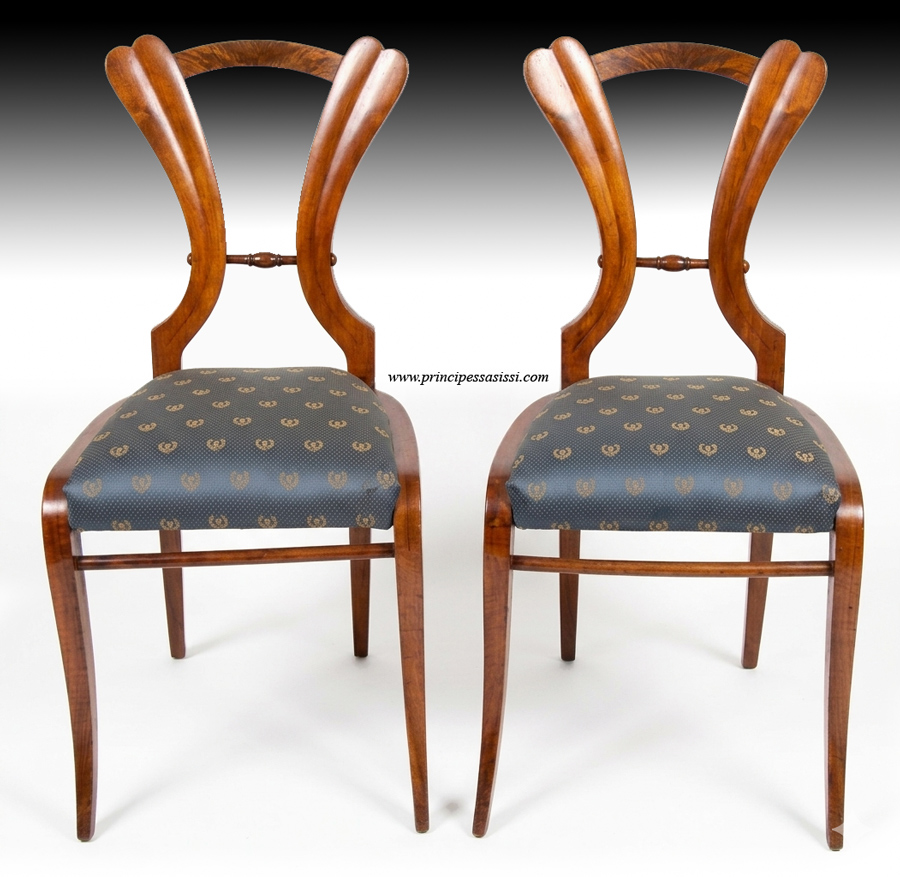 Vienna, 1820-25 c.a. Straordinarie nella modernità, elegante coppia di sedie integre dei designers viennesi del più raffinato biedermeier, attribuibili ad Joseph Danhauser o alla sua immediata cerchia ( mod. n.131, dalle lievissime differenze possibile personalizzazione o anche evoluzione dal disegno originale del 1815- vedi miniatura all'interno della seconda foto inserita per facilitarne il confronto). Lastronate in piuma di noce biondo combinato con radica di noce su struttura in legno d'acero (tipico di J. Danhauser). Vienna 1825-30. Alt. cm.90,5, seduta cm.49. Le opere si trovano in condizioni di integrità, anche la tappezzeria della seduta solo ricoperta con lussuosa stoffa blu di gusto impero. Consolidate e con finitura operata a gommalacca apllicata atampone con tecnica di standard museale. In prima calda patina color ambra. Nella miniatura il disegno progettuale originale della sedia mod. 131 di Joseph Dahnauser (proprietà del Museo delle arti applicate di Vienna visibile su appuntamento). Giuseppe Danhauser Ulrich (nato il 14 marzo 1780 a Vienna; † 9 gennaio 1829 a Ibidem), è stato un geniale designer e il miglior produttore di mobili Biedermeier. Operava a Wieden, a Vienna. Vantava come clienti la più alta nobiltà,la casa reale e l'alta borghesia. Osserva la seconda foto di questa scheda, che è una simulazione informatica di fantasia ove l'opera è immaginata in un contesto d'arredamento moderno d'alta gamma. Emergono una "modernità", una luminosità ed un'astrazione stupefacenti per un opera concepita oltre due secoli fa. Con un gran tocco di classe ed eleganza all'insieme. L'alta ebanisteria antica viennese del periodo del neo classicismo (1770 - 1830), dalla sobria e minimale eleganza, dalle essenze pregiate e chiare, si lega molto alle linee dell'arredo moderno contemporaneo. |