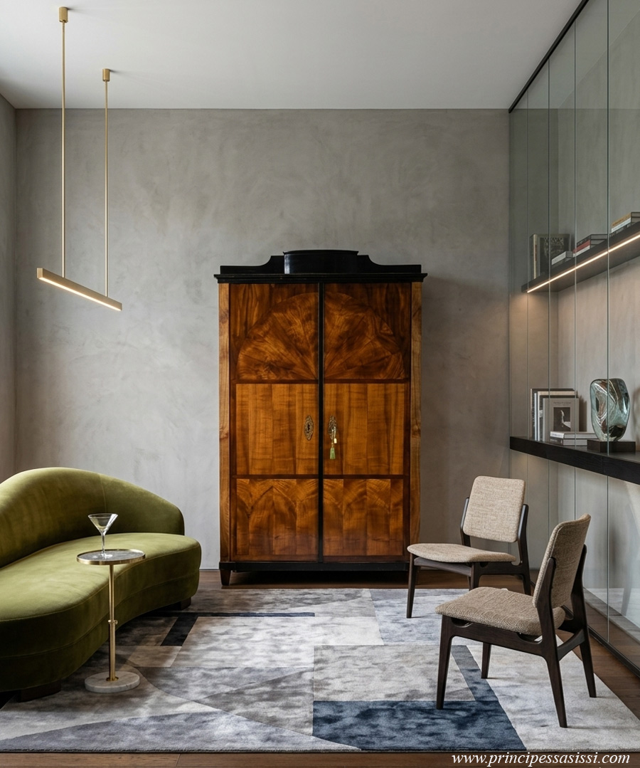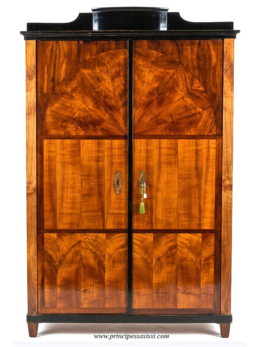 in piuma di ciliegio e ciliegio visciolo con combinazione delle cartelle a mo' figurativo, reminescenza di portale classico. Particolari ebanizzati con lacca integra. Cassetto superiore nascosto nella cimasa. . Cm.alt.185 x prof.48, lar 117. In prima patina, magistralmente lucidato a gommalacca a tampone con tecnica di standard museale. N.B. I mastri ebanisti viennesi del periodo biedermeier conoscevano i luoghi dove crescevano gli alberi migliori e ne mantenevano il segreto. Per ottenere dei lastroni dalle venture di tale bellezza conoscevano anche i migliori punti dell'albero e ne tagliavano le parti con grande perizia, ottenendo con il legno degli effetti che costituiscono l'attrattiva particolare dei veri mobili biedermeier e ne rappresentano un'unicità ed un'eccellenza nel mondo del mobile d'alto antiquariato di tutte le epoche. Mirabile, calda e luminosa opera d'alta ebanisteria, dalle preziose essenze magistralmente combinate dal design minimale e "moderno", perfetta anche per il raffinato e lussuoso inserimento in un contesto d'arredi moderni d'alta gamma (osserva la simulazione a fondo pagina).