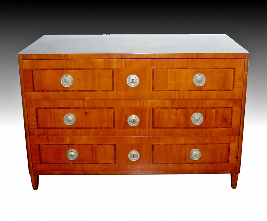 Raro e decorativo comò del classicismo viennese integro, lastronato in piuma di ciliegio con intarsi in acero e prugno. Vienna 1770 c.a. Cm. 125 x 63 x86.Luminoso
