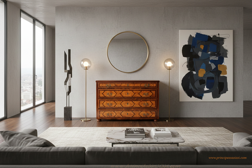 Osserva la foto a seguire, che è una nostra simulazione informatica di fantasia ove l'opera è immaginata in un contesto d'arredamento moderno d'alta gamma. Emergono una "modernità", una luminosità ed un'astrazione sorprendenti per un opera concepita due secoli fa, oltre che un gran tocco di classe ed eleganza all'insieme. L'alta ebanisteria antica viennese, dalla sobria e minimale eleganza, si lega molto alle linee dell'arredo moderno.