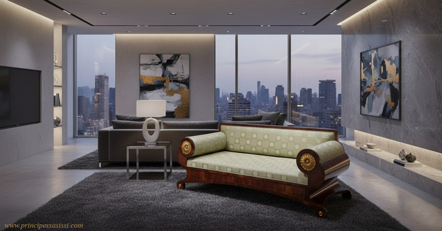 Vienna, 1825-30 c.a. Straordinario divano da riposo del biedermeier viennese, dalle sobrie ed eleganti linee, lastronato in piuma di noce biondo. Linea di raffinata eleganza e d'incredibile modernità. edi infatti nell'ultima foto di questa scheda, una nostra elaborazione informatica di fantasia ove l'opera è inserita in un contesto d'arredamento moderno d'alta gamma; una "modernità" sorprendente per un opera concepita due secoli fa. Alta ebanisteria viennese che potrebbe anche essere attribuita alla produzione di Joseph Danhauser o alla sua cerchia. Ciò oltre che per la geniale linea e i dettagli stilistici, anche per la magistrale tecnica esecutiva con i fianchi fortemente ricurvi. Per ottenere una curvatura così spinta, il geniale ebanista, dopo aver realizzato la struttura a doghe dei fianchi con legno tenero, ha applicato nei punti più ricurvi i lastroni in piuma di noce, manualmente assottigliati e poi specchiati nella modalità caratteristica dei mobili viennesi dell'impero e del biedermeier, su di un primo strato di lastronatura realizzata in controvena con elastica essenza, probabilmente faggio. Questa complessa e geniale tecnica di "assottigliamento e doppia lastronatura" serviva ad evitare la frattura degli stessi nei punti maggiormente ricurvi appunto. L'opera si trova in condizioni di conservazione e integrità molto buone; è in prima patina, con finitura a gommalacca applicata a tampone con tecnica di standard museale. E' infine tappezzato con la tecnica originale dell'epoca, senza uso di molle. La tappezzeria dello schienale è originale e integra; è stata da noi igienizzata e ricoperta. Al di sotto dello splendido tessuto Juaquard in "antico verde" satinato con motivi a roselline, giace, protetta, la stoffa originale del periodo da noi appunto appositamente preservata con tecnica conservativa a regola d'arte. I motivi a roselline laterali, sono scolpiti e dorati a foglia. Restaurato e consolidato con finitura a gommalacca applicata a tampone con tecnica di standard museale. Un opera simile, dalle affini linee anch'essa lastronata in piuma di noce su legno tenero e di faggio, di proprietà della collezione nazionale del Museo del mobile di Vienna, proveniente dal castello di Schonbruenn, è stata esposta alla mostra internazionale "Biedermeier, l'invenzione della semplicità", Albertina , Vienna, anno 2007, catalogo II - 63 (vedi foto fondo pagina). Larghezza cm. 197. Profondità cm. 81, altezza cm. 82. La seduta è a cm. 44 d'altezza; è larga cm. 155 (135 fra i braccioli), profonda cm.71. |