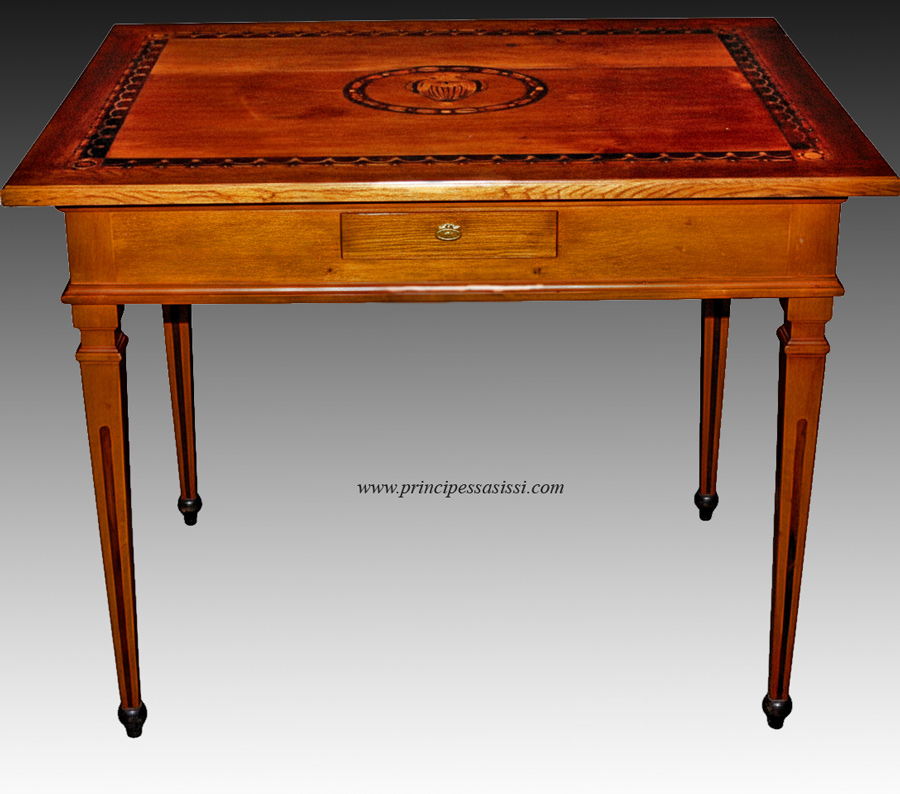 Raffinato e raro tavolo da gioco del classicismo viennese. Austria 1770 c.a . E' opera integra magistralmente lastronata e intarsiata in modo figurativo con legni esotici e di frutto (rosewood verosimilmente delle qualità Nectranda Mollis e Piptadenia Svaveolens), prugno, ebano, radica d'acero ecc. L'intarsio, figurativo a motivi di vaso e festoni, tipici del periodo, è arricchito con dettagli lavorati in pirografia e a nerofumo. Misura piano cm. 96 x 70, alt. 77. L'opera
