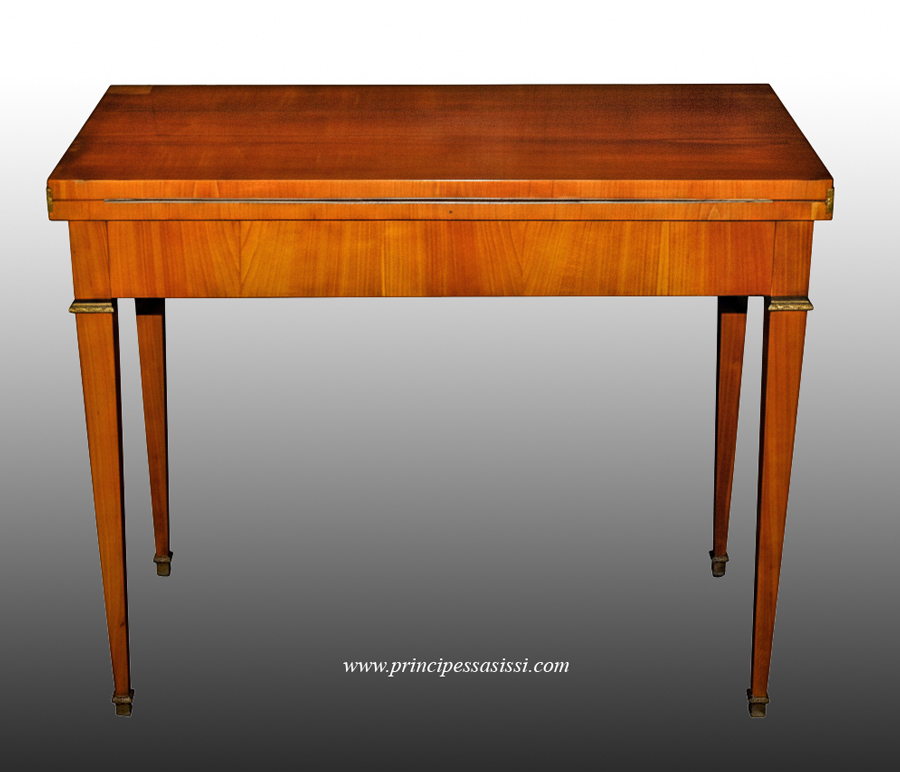 --> IMPORTANTE: Per richiedere prezzo o informazioni su quest'opera, clicca la casella rossa CONTATTO\RICH.NOTIZIE subito qui sopra. Si aprirà automaticamente la mail per noi a info@principessasissi.it | | Raffinato e raro tavolo da gioco del classicismo - impero viennese. Vienna 1790 -1810 c.a. Lastronato in piuma di ciliegio specchiato, con applicazioni/ motivi ornamentali in bronzo tipici del periodo. Il tavolo si apre a libro ruotando su se stesso e mostrando il piano da gioco in raffinata pelle (quest'ultima solo sostituita). E' opera in condizioni di pratica integrità con finitura a gommalacca applicata a tampone con tecnica di standard museale su prima patina. Misura cm.78 d'alt, 47,5 x 95 largh, 95x95 piano aperto. Elegante e luminoso mobile dalle linee "pulite" e minimaliste, perfettamente associali al moderno d'alta gamma in un'insieme di prestigio e raffinatezza. |