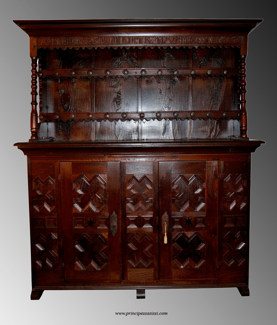 Affascinante credenza antica con alzata in prima patina ed in condizioni d'integrità assoluta denominata in lingua tedesca "Kannenstock", ossia "contenitore per caraffe con manico". Questo tipo di mobile, nei paesi in lingua tedesca, era realizzato su committenza per arredare le cantine dei castelli. Nella parte superiore vi eran appese le caraffe contenenti vino ed altre bevande agli appositi sostegni torniti. Nella parte inferiore erano conservate stoviglie, bicchieri e bottiglie. Nella parte superiore dell'alzata vi è un iscrizione in bassorilievo realizzata per celebrare probabilmente un matrimonio. Tali mobili infatti erano donati dalle famiglie degli sposi per arredare la residenza comune, come regalo nuziale. Nell'iscrizione leggiamo i nomi degli sposi, vi sono scopiti inoltre un cuore ed una data (1786). tale data è presumibilmente posteriore a quella di realizzazione del mobile di gusto neoclassico (vedi formelle geometriche e rosa dei venti intarsiata) comunque avvenuta nel XVIII° secolo. E' uno splendido mobile dalla calda patina e dalle condizioni di conservazione museali, adatto ad arredare una parete intera in una prestigiosa taverna od anche un salone, oppure un ristorante d'alta classe. E' in legno di quercia e frassino combinati massello, con intarsi alla certosina in legno di ebano (rose dei venti). La finitura è a gommalacca a tampone con effetto "opaco semilucido" adatto a questo tipo di mobili; il tutto su prima patina e con tecnica di standard museale. Larg.cm. 194, Altezza 220 cm, Profondità 57 cm |