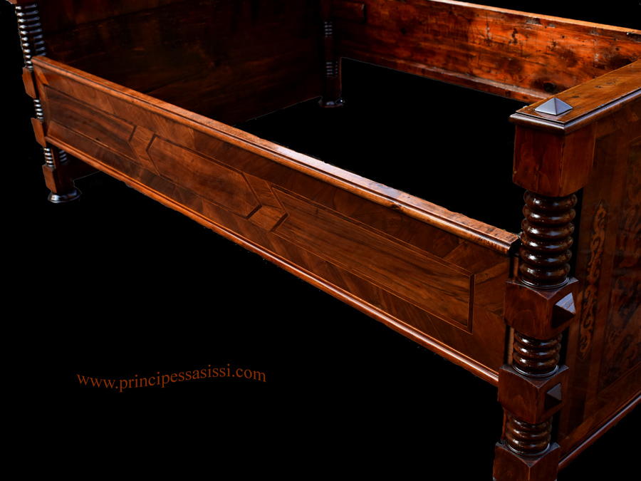 in legno d'acero, prugno e decorazioni a china. Colonne tornite. Dettagli decorativi in legno d'acero. E' in condizioni di pratica integrità, restaurato con criterio conservativo a regola d'arte con finitura a gommalacca a tampone su prima patina. Pronto per essere tappezzato. Patina e segni d'uso corrispondenti all'epoca. Interessanti e rare le dimensioni di cm. 191 di lunghezza interna, 209 massima, larghezza interna 128,5, massima 137,altezza spalla 77,5. Sono rare in quanto all'epoca le persone erano normalmente di piccola statura e questo letto è stato realizzato per una persona insolitamente alta. . L'uccello con la cresta così splendidamente intarsiato, è verosimilmente un'upupa, affascinante uccello che mostra la cresta nel corteggiamento e per amore. Anche le due colombe contrapposte nella parte alta che si incontrano sono simbolo d'amore e pace. Quest'opera, come d'uso all'epoca, è stata probabilmente realizzata per celebrare l'amore e il matrimonio fra due rampolli della nobiltà austro