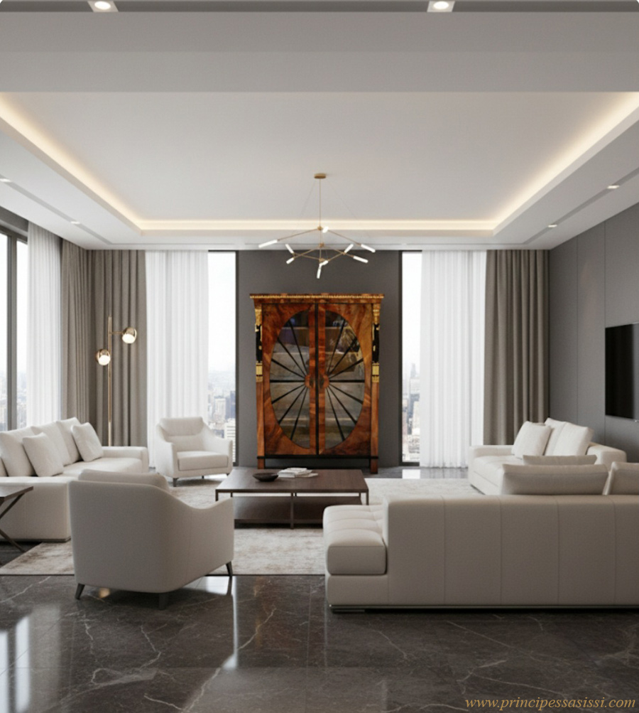 Cariatidi finemente scolpite e dorate a foglia con basi a motivo d'acanto tipici del periodo e della provenienza. originali porte creanti un motivo circolare con raggi ebanizzati che dipartono a raggiera simboleggianti il sole, come simbolo dell'eternità, sempre riprendendo la cultura egizia antica, e come motivo presente nell'impero viennese. Interni con lacca originale dalla delicata tinta bianco avorio, patinata dal tempo. Motivo a baccellature scolpite e dorate a foglia decoranti la cimasa tipico dell'epoca e della provenienza, a reminescenza della Roma antica.