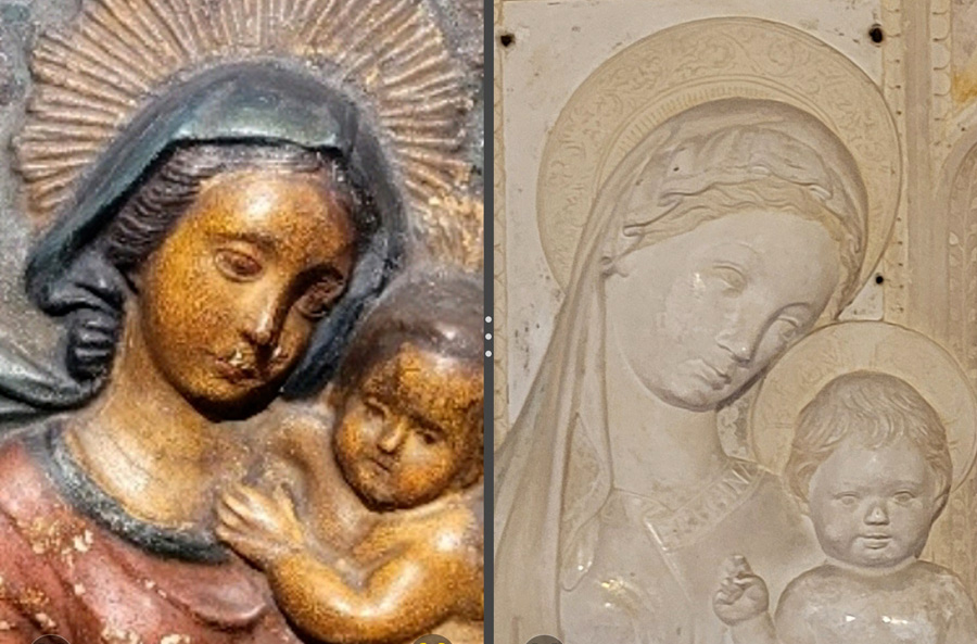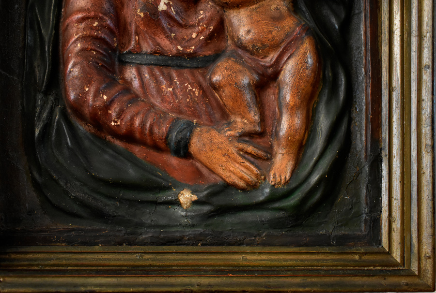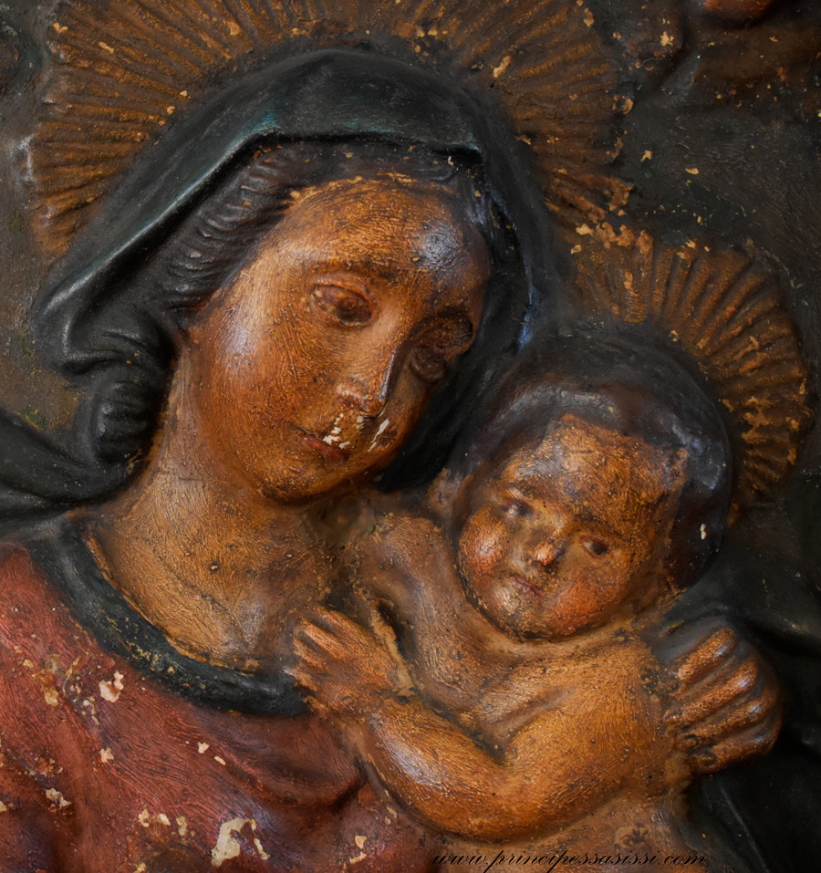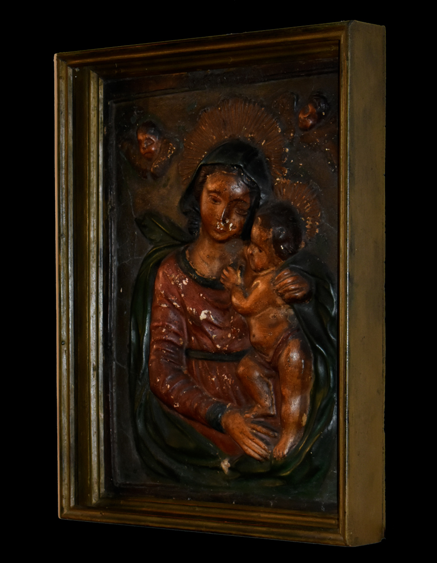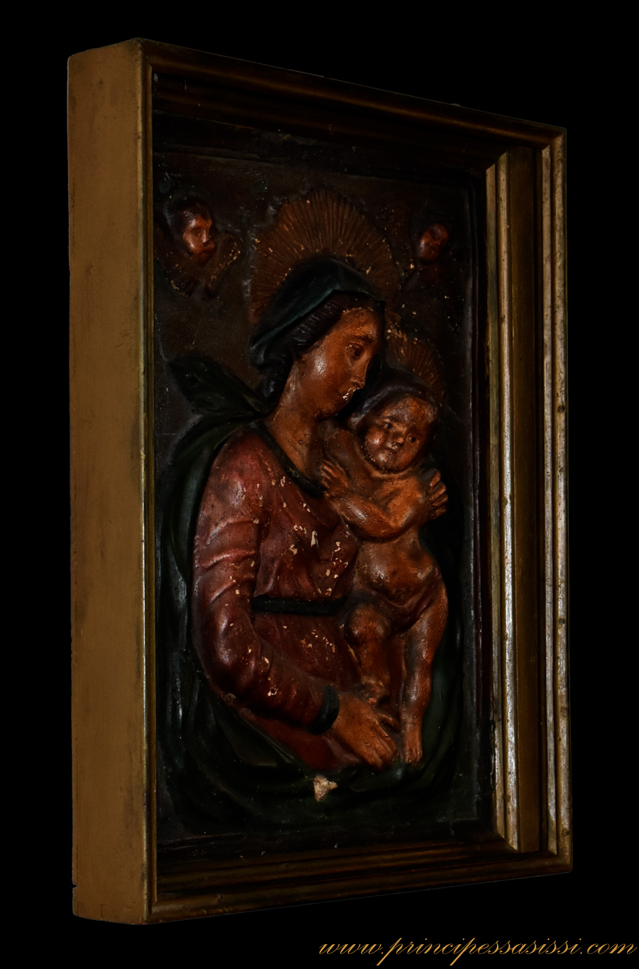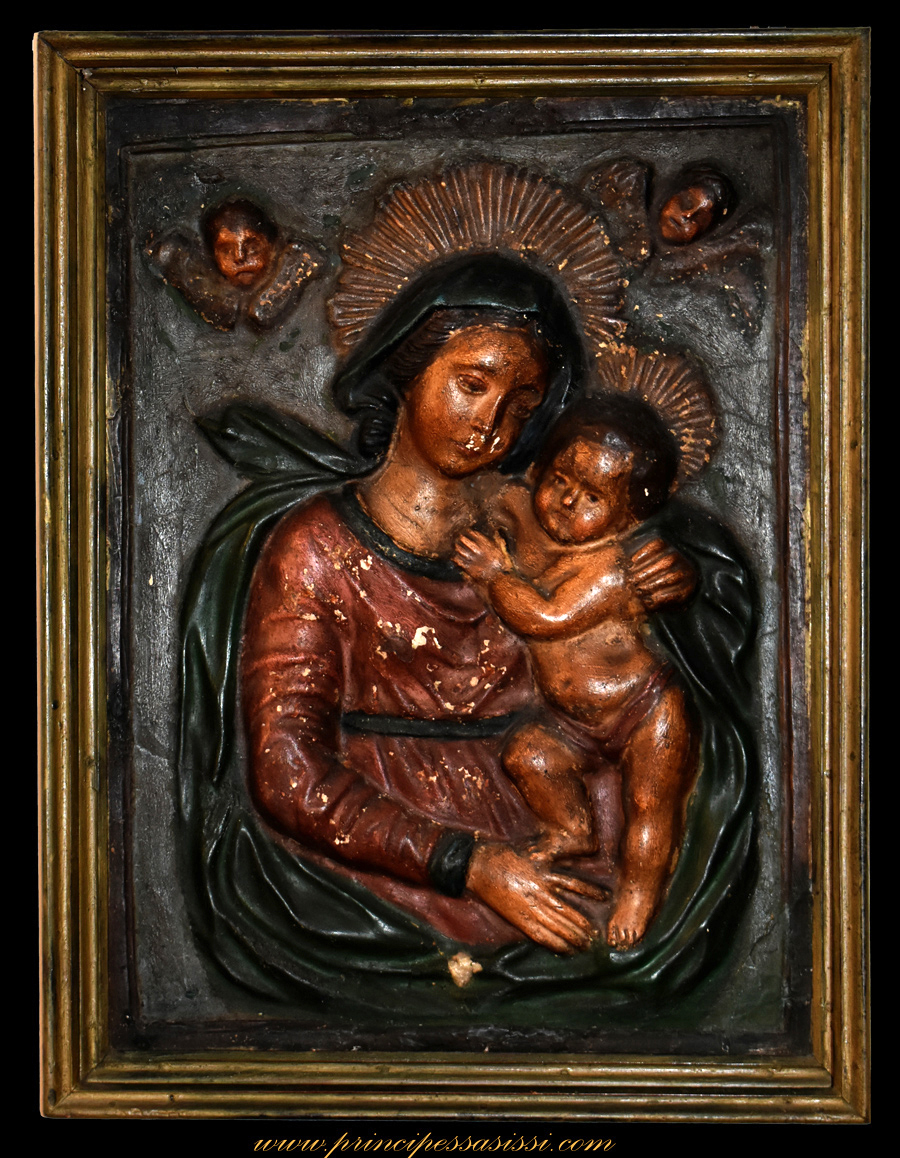 Rilievo – Stucco e cartapesta policroma, bottega toscana 1480 – 1490 c.a. Questo rilievo farebbe parte di un gruppo di esemplari calco in stucco e cartapesta da un lavoro di Benedetto da Maiano, probabilmente identificabile col rilievo in marmo ora appartenente alla National Gallery of Art di Washington (vedi confronto con quest'opera nell'ultima foto). Altre 2 opere affini, molto simili ma in calchi di solo stucco, sono conservate allo Spitale degli Innocenti e al museo Bardini a Firenze. Un'ulteriore opera, molto simile è stata venduta ad un'asta in Roma un secolo fa (Jandolo e Tavazzi 25 aprile-3 maggio 1910, n. 290) ed ora è esposta anch'essa alla National Gallery of Art di Washington (USA). Altra opera affine appartenente a privata collezione, è esposta alla Casa de Rodis, a Domodossola (Italia). La cornice,è in legno lavorata con modanature aggettanti appare originale con segni di integrazioni posteriori. L'opera si trova in condizioni d'originalità senza interventi di restauro operati o altre alterazioni, conserva la policromia originale con blu del mantello all'azzurrite, tipico del periodo e della provenienza, ora virato al verde. Presenta patina e segni del tempo coerenti con l'antichità. Misura cm. 61 x 70 comprensivi della cornice. Il genio di Benedetto da Maiano è quello spontaneo ed universale. La fattura di questa statua in cartapesta policroma, specie nei volti della Madonna e del Bambino, testimonia la possibile attribuzione alla bottega del grande maestro, che produceva, così come altre botteghe toscane del periodo come quella di Donatello, anche opere meno costose rispetto ai modelli in marmo. Ciò per venire incontro anche ad una committenza meno ricca. Anche l'uso del pigmento dell'azzurrite (pigmento naturale in uso fino al XVIII° secolo) invece che dei più costosi lapislazzulo o blu oltremarino (che non sarebbero virati verso il verde come nella nostra opera), avalla tale ricostruzione. Anche dal punto di vista stilistico, l'opera è tipicamente quattrocentesca, in quanto poi, nel cinquecento e nel seicento, il gusto nella visione e rappresentazione sacra della Madonna con il Bambino cambia completamente. NOTE : Altri stucchia affini della stessa bottega oltre ai citati sono conservati nel Museo Civico di Prato, nell’Oratorio dell’Oca a Siena e nel Museo dell’Opera del Duomo di Perugia. (Bibliografia in tema D. Carl, “Benedetto da Maiano. A Florentine Sculptor at the Threshold of the High Renaissance”, Turnhout 2006, G. Gentilini, Museo Civico di Prato. “Le collezioni d'arte, a cura di M.P. Mannini” ; R. Kecks “Eine Bilderfindung Botticellis in der Werkstatt des Benedetto da Maiano”, Mitteilungen des Kunsthistorischen Institutes in Florenz). |