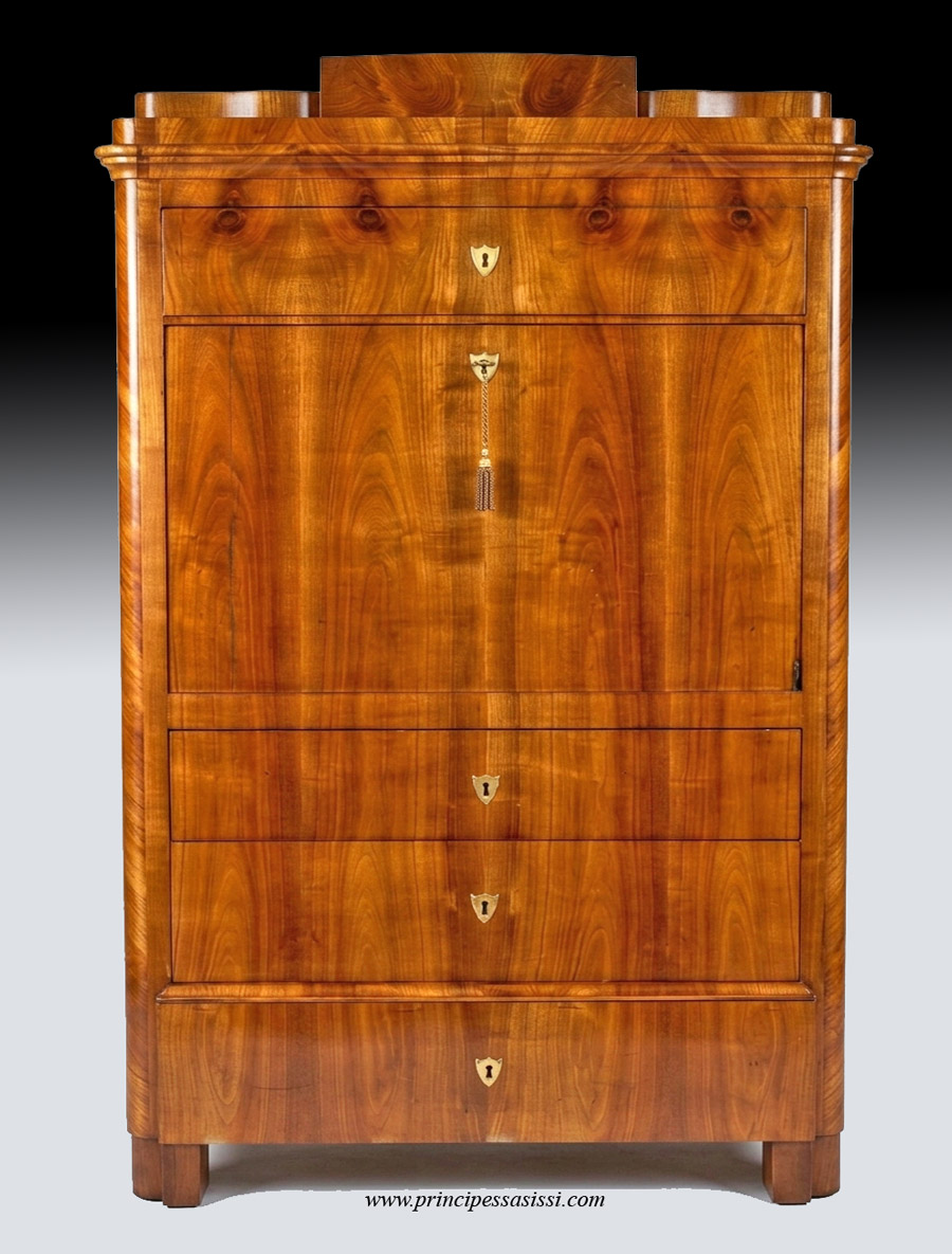 Vienna 1820-25. Raro secretaire della prima fase del periodo biedermeier viennese, in condizioni di pratica integrita' . Il mobile e' in in prima patina magistralmente lastronato in piuma di ciliegio con interni a motivo di portale di tempio classico con scalinata e colonne. L'interno e' lastronato in piuma di mogano con eleganti filettature in acero. Vani segreti. particolari in osso animale. Letteratura "Biedermeier arte e cultura nella mitteleuropa", SKIRA ed. pag.76, riportato un secretaire molto simile, conservato al museo delle arti applicate di Praga. Misura cm.172 x 104 prof.54 /101. Altezza piano scrittura 80. . Guarda come questo sobrio ed elegante mobile antico dalle "moderne linee" si abbina all'arredamento moderno d'alto livello - foto a fondo pagina (simulazione da noi realizzata elettronicamente - gli altri oggetti moderni non sono nostri e\o in vendita da noi - solo un esempio "creativo" d'abbinamento - sono fatti salvi i diritti dei terzi ) . In condizioni di pratica integrità, dalla calda patina e ,meravigliosa tonalità, con finitura a gommalacca applicata con tecnica di standard museale su prima patina.