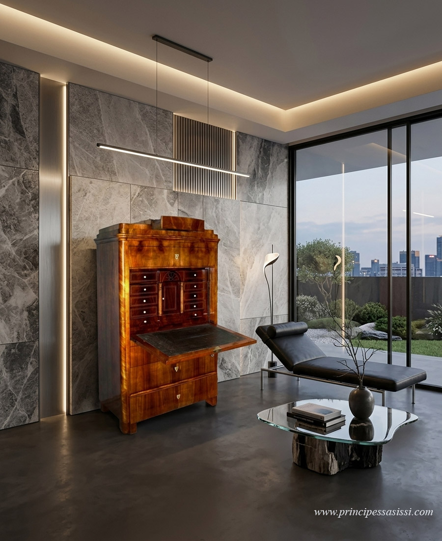 Osserva la foto a seguire, che è una simulazione informatica di fantasia ove l'opera è immaginata in un contesto d'arredamento moderno d'alta gamma. Emergono una "modernità", una luminosità ed un'astrazione stupefacenti per un opera concepita oltre due secoli fa. Con un gran tocco di classe ed eleganza all'insieme. L'alta ebanisteria antica viennese del periodo del classicismo (1770 - 1830), dalla sobria e minimale eleganza, dalle essenze pregiate e chiare, si lega molto alle linee dell'arredo moderno contemporaneo. N.B. Per queste motivazioni e per la qualità costruttiva e delle essenze utilizzate, gli stili primo impero e primo biedermeier viennese dei designers, prototipi del modernismo, risultano attualmente nel mercato internazionale fra gli stili più richiesti da architetti e arredatori, destinati a forte rivalutazione futura; ciò anche in considerazione della rarità e scarsa disponibilità degli originali viennesi d'alta ebanisteria nel mercato.