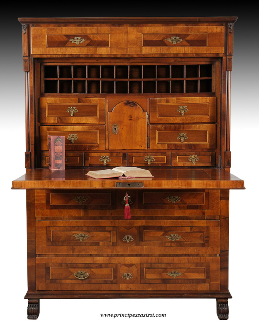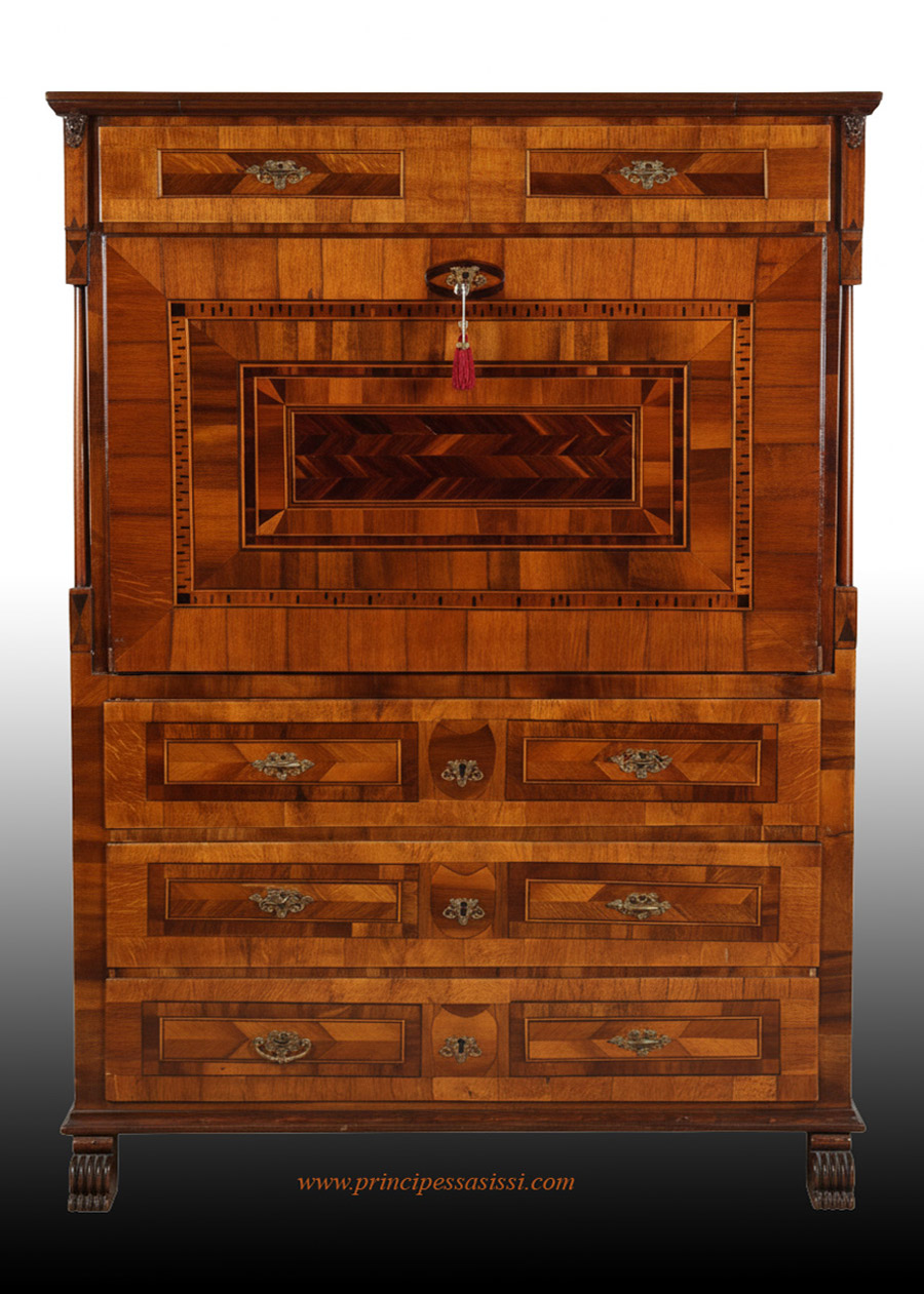 | Vienna, 1770 c.a . Monumentale e raro secretaire del neoclassicismo viennese, magistralmente lastronato e intarsiato in legni di noce e piuma di noce, ciliegio, rovere, pero acero, combinati e specchiati a motivi geometrici. Eleganti colonnine stiizzate ai fianchi. Opera ottimamente conservata e in patina. Restaurata a regola d'arte antica con criterio conservativo e con lucidatura alla francese mediante uso di gommalacca con maestria di standard museale. Misure cm. 161 d'altezza, 110 di larg., 53 - 110 aperto di larghezza. |