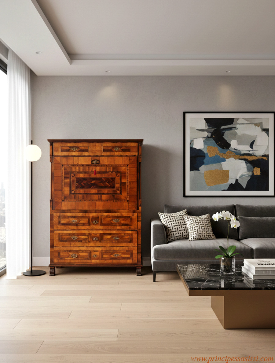 Osserva la foto a seguire, che è una simulazione informatica di fantasia ove l'opera è immaginata in un contesto d'arredamento moderno d'alta gamma. Emergono una "modernità", una luminosità ed un'astrazione sorprendenti per un opera concepita oltre due secoli fa, oltre che un gran tocco di classe ed eleganza all'insieme. L'alta ebanisteria antica viennese, dalla sobria e minimale eleganza, si lega molto alle linee dell'arredo moderno.