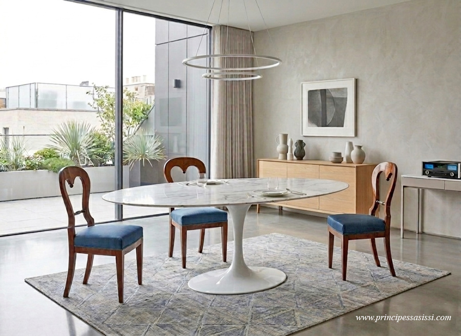 Osserva la foto a seguire, che è una simulazione informatica di fantasia ove l'opera è immaginata in un contesto d'arredamento moderno d'alta gamma. Emergono una "modernità", una luminosità ed un'astrazione stupefacenti per un opera concepita oltre due secoli fa. Con un gran tocco di classe ed eleganza all'insieme. L'alta ebanisteria antica viennese del periodo del classicismo (1770 - 1830), dalla sobria e minimale eleganza, dalle essenze pregiate e chiare, si lega molto alle linee dell'arredo moderno contemporaneo.