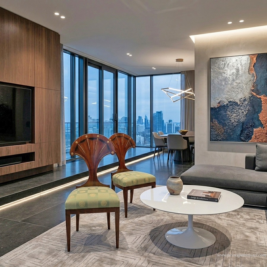 Straordinaria coppia di sedie di rilievo museale del primo impero viennese con schienale a forma della lira. Opere con linea d'incredibile modernità, ai vertici dell'alta ebanisteria viennese del primo impero. Probabilmente le più belle sedie dello stile dell'impero viennese esistenti, se paragonate con quelle note in pubbliche gallerie o pubblicate nei testi d'argomento. Sono lastronate in mogano e piuma di mogano di due diverse tonalità combinate, con delicati intarsi e filettature in legno d'ebano. Motivi di roselline e palmette sbalzati in ottone. Le opere si trovano in condizioni d'integrità con finitura a gommalacca applicata a tampone su prima patina con tecnica di standard museale. La tappezzeria è originale ricoperta di elegante tessuto Jaquart in verde pompeiano con motivi a roselline. Vienna 1810 c.a, possibilmente Johann Ertl, ebanista di corte. Pubblicate nel catalogo della mostra biennale Ghota di Parma, novembre 2018. Misure cm. 92,5 d'altezza, cm. 46 di larg. massima, profondità cm. 44,5, altezza seduta cm.47. Osserva l'ultima foto di questa scheda, che è una simulazione informatica di fantasia ove l'opera è immaginata in un contesto d'arredamento moderno d'alta gamma. Emergono una "modernità", una luminosità ed un'astrazione stupefacenti per un opera concepita oltre due secoli fa. Con un gran tocco di classe ed eleganza all'insieme. L'alta ebanisteria antica viennese del periodo del neo classicismo (1770 - 1830), dalla sobria e minimale eleganza, dalle essenze pregiate e chiare, si lega molto alle linee dell'arredo moderno contemporaneo. |