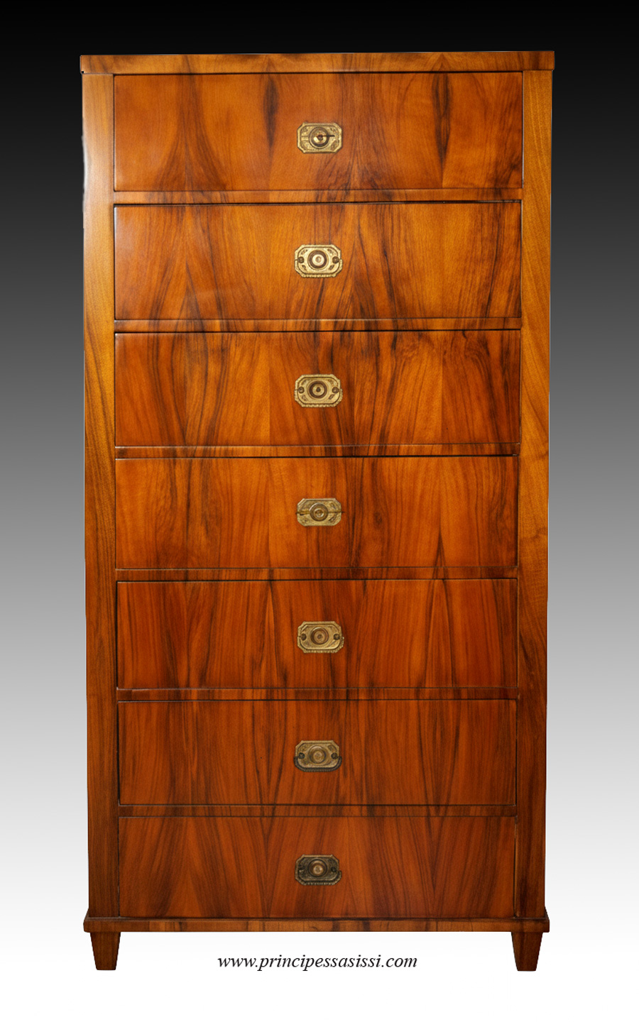 Rara chiffoniere comò settimanale del primo periodo biedermeier viennese, di pratica integrità e in prima patina, lastronata in piuma di noce biondo fiammato. Vienna 1815-20 c.a. Vi è un ingegnoso meccanismo meccanico che assicura il comando della chiusura di tutti i cassetti chiudendo il primo, che è dotato di serratura originale; tutti gli altri cassetti sono apribili solo socchiudendo il, primo cassetto in una particolare posizione. Opera in patina e in condizioni di pratica integrità anche nella ferramenta, con finitura a gommalacca applicata a tampone con tecnica di standard museale. Cm.148 x 72 x40 prof.. Magnifica opera dal design che "vince il tempo" dalla sobria ed elegante linea, ottima anche per l'accostamento al moderno d'alta gamma per un insieme unico, esclusivo e di raffinata eleganza (vedi foto di simulazione d'accostamento al moderno a fondo pagina). Dal caldo colore dorato ambra della patina antica del noce biondo con finitura a vera gommalacca a tampone. |