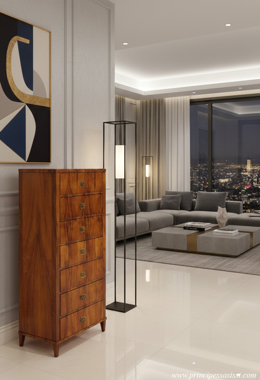 Osserva la foto a seguire, che è una simulazione informatica di fantasia ove l'opera è immaginata in un contesto d'arredamento moderno d'alta gamma. Emergono una "modernità", una luminosità ed un'astrazione sorprendenti per un opera concepita oltre due secoli fa, oltre che un gran tocco di classe ed eleganza all'insieme. L'alta ebanisteria antica viennese, dalla sobria e minimale eleganza, dalle essenze pregiate e chiare, si lega molto alle linee dell'arredo moderno.