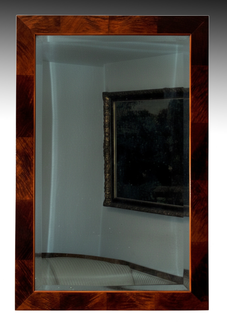 Decorativa specchiera del periodo del primo impero/primo biedermeier, Vienna, 1810-15. Lastronata in mogano con dettagli in acero. In condizione d'integrità con finitura a gommalacca appicata a tampone con tecnica di standard museale su prima patina. Anche la parte vetrata integra, è originale. Dal magico riflesso ovattato dello specchio antico. Cm.115 x 75.