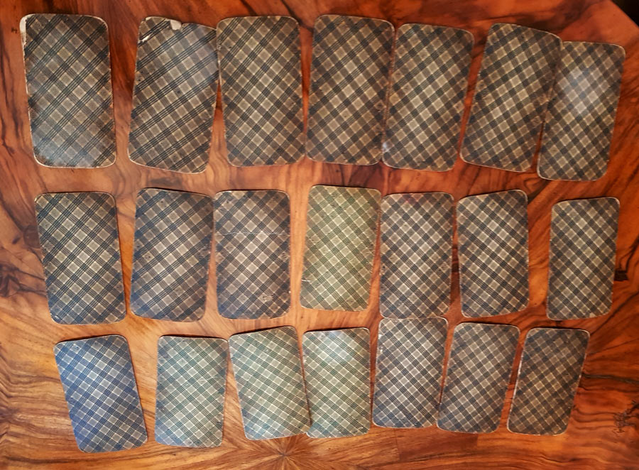 Molto raro mazzo completo di 21 affascinanti carte da gioco del tarocco del secondo terzo dell'ottocento, dalle meravigliose illustrazioni. Il mazzo si trova in visibili condizioni molto buone per l'epoca con patina e segni d'uso coerenti con l'antichità. Austro Ungheria, secondo terzo dell'ottocento. Vicino alla miniatura raffiguarante l'Hofburg di Vienna (residenza imperiale degli Asburgo), il simbolo dell'acquila dell'impero austro ungarico e le parole in lingua ungherese "szerencse fel"= fortuna e prosperità. Altezza di ogni singola carta cm.13,7. D'elevato interesse collezionistico o una originale idea per un prestigioso regalo. Si possono incorniciare e appendere alla parete. La foto di una matrice per delle carte simili della prima metà dell'ottocento a fondo pagina ( Da "Das K.K. Nationalfabriksproduktenkabienett , Technik und design des Biedermeier" , Technisches Museum Wien, pag. 172) . Non marchiate, ma probabilmente la manifattura è Ferdinand Piatnik, all'epoca con sedi a Vienna e Budapest. |