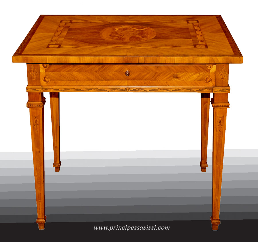 Vienna 1770 c.a. Raro tavolo da gioco in museali condizioni di conservazione, d'integrità assoluta ed in prima patina, del periodo del classicismo. E' magistralmente intarsiato a motivi geometrici e floreali, con medaglione centrale intarsiato a nastri, ghirlande e note musicali delineate a pennino. Dettagli e ombreggiature realizzati con la tecnica della pirografia. E' lastronato e intersiato nelle essenze della piuma di noce, piuma di ciliegio, acero, acero tinto, bois de rose o tasso, nonché prugno o amaranto. E' mobile d'alta ebanisteria austriaca dalle squisite dimensioni. Con quattro cassetti laterali anch'essi originali, destinati al contenimento delle carte e fiches dell'epoca. In prima patina come già scritto, con finitura a gommalacca a tampone con tecnica di standard museale. D'integrità assoluta certificata. Provenienza : famiglia nobiliare dell'Europa Centrale. Altezza cm.78, piano cm.90 x 70. Guarda come questo eccezionale tavolo antico dalle sobrie ed eleganti linee si abbina all'arredamento moderno d'alto livello (a fondo pagina - simulazione da noi realizzata elettronicamente - gli altri oggetti moderni non sono nostri e\o in vendita da noi - solo un esempio "creativo" d'abbinamento - sono fatti salvi i diritti dei terzi ) |
