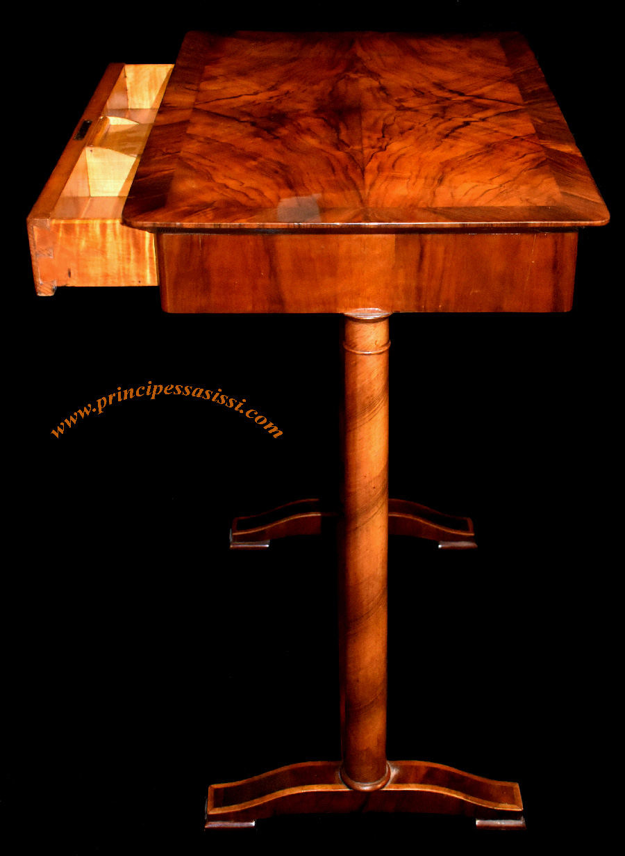 Vienna 1830 c.a. Lussuoso ed elegante tavolino da lavoro lastronato in piuma di noce. Opera splendidamente conservata ed in condizioni d'integrità. Piuma di noce d'elevata qualità dalle vive venature specchiate e nei sostegni orienate a modalità elicoidale. Ossatura cassetto in legno d'acero nobile. Dettagli decorativi e filettature in acero. In patina, con finitura a gommalacca applicata a tampone con tecnica di standard museale. Misure cm. 66,5x44,5 piano 78 alt. I mastri ebanisti del periodo biedermeier conoscevano i luoghi dove crescevano gli alberi migliori e ne mantenevano il segreto. Per ottenere dei lastroni dalle venture di tale bellezza conoscevano anche i migliori punti dell'albero e ne tagliavano le parti con grande perizia, ottenendo con il legno degli effetti che costituiscono l'attrattiva particolare dei veri mobili biedermeier e ne rappresentano un'unicità ed un'eccellenza nel mondo del mobile d'alto antiquariato di tutte le epoche.