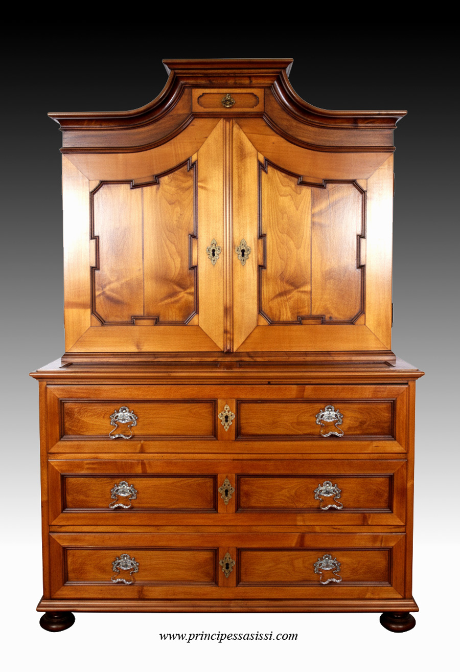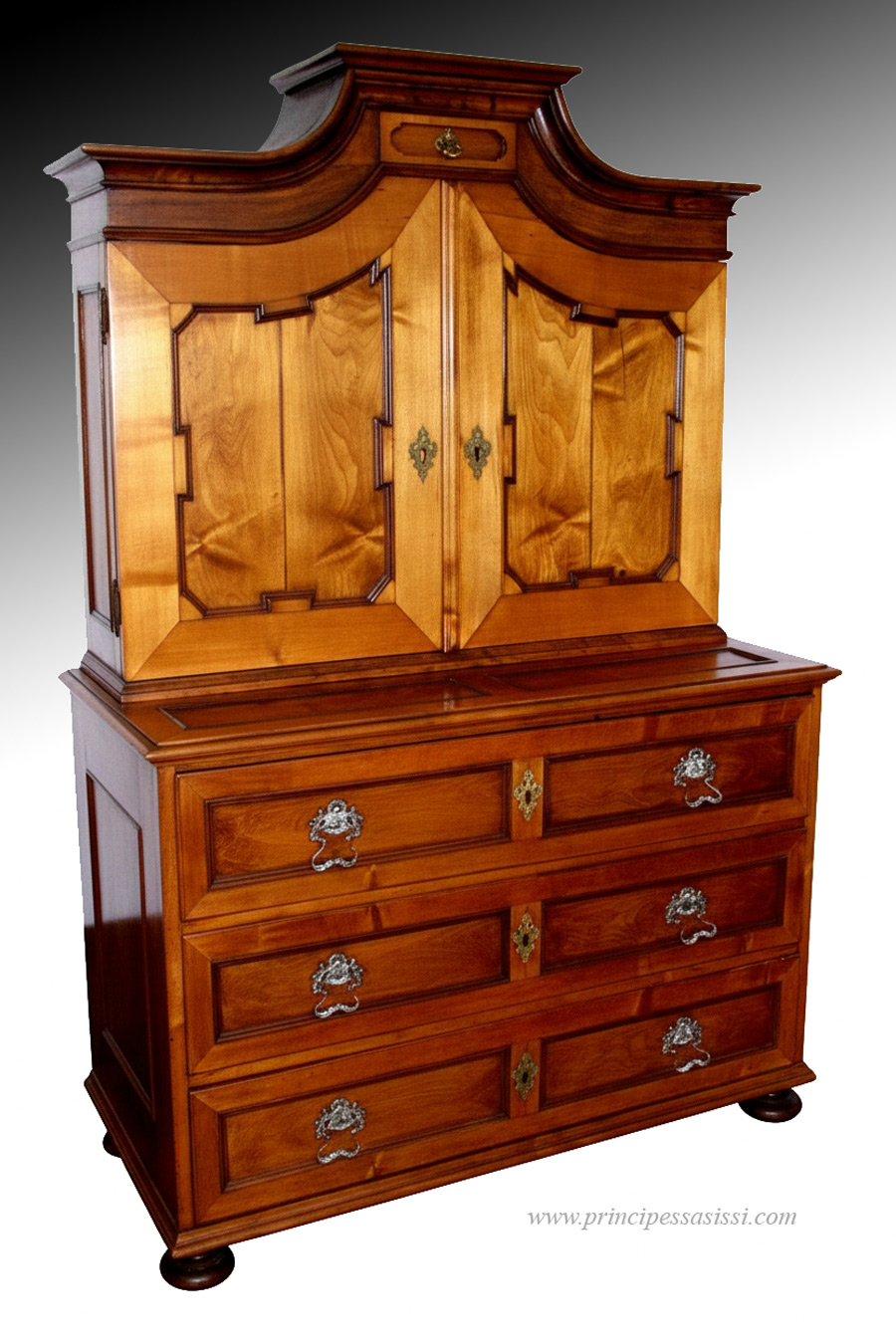 Decorativo, chiaro e luminoso mobile a doppio corpo / trumeau anche ad uso credenza austriaco del secolo XVIII°. L'opera è magistralmente lastronata in piuma d' acero con venature combinate in modo da creare effetti derivanti dallo studiato orientamento. Eleganti cornici decorative a motivo di formella spezzata barocca nel fronte, in legno di prugno massello. Nella sua sobria semplicità, è attraente e luminosa opera perfettamente accostabile all'arredamento moderno d'alta gamma
