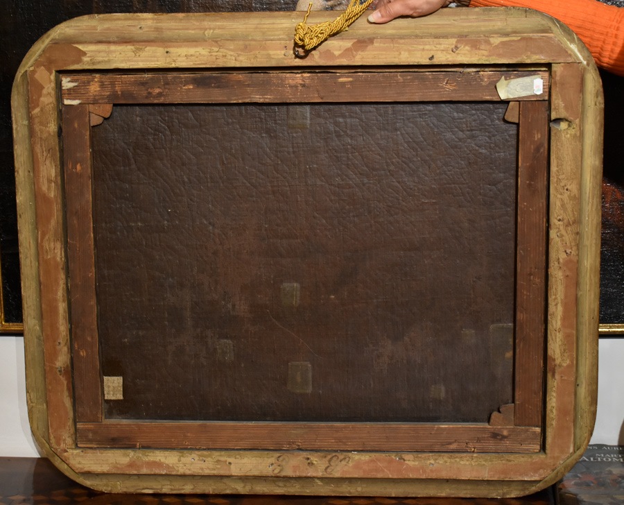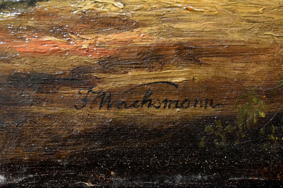 Bedøich Friedrich Wachsmann 1849, firmato in basso a destra. Importante olio su tela. Veduta del castello sul lago Traunsee e del paesino di Gmunden (Salisburghese, Austria). Pregevole opera di gusto biedermeier del noto pittore tedesco-boemo che vanta valutazioni in costante ascesa. Mirabile viva cromia con sapiente uso della luce, che rende il dipinto "plastico" e quasi tridimensionale. In ottime condizioni di conservazione con cornice coeva originale dorata a foglia. Misure cm. 69 x 55 tela, 85x72 con cornice. Un'opera dell'autore simile nella Galleria Nazionale di Praga